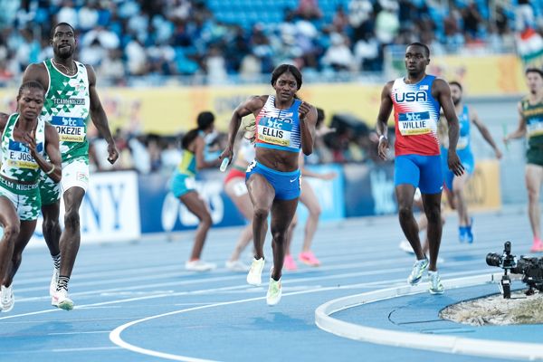 Just 11 minutes later, the championship record was smashed again, this time by world champions USA. Matthew Boling, Lynna Irby-Jackson, Ryan Willie and Kendall Ellis teamed up to win in 3:11.52, finishing more than two seconds ahead of Nigeria (3:13.79).